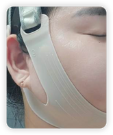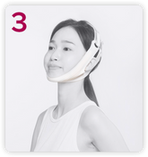 輕輕拉伸提升帶並將其置於下巴下方,往上勾掛至耳後,確保貼合臉部輪廓與下巴線條。此款為可調式魔鬼氈設計,能依照個人臉型調整鬆緊